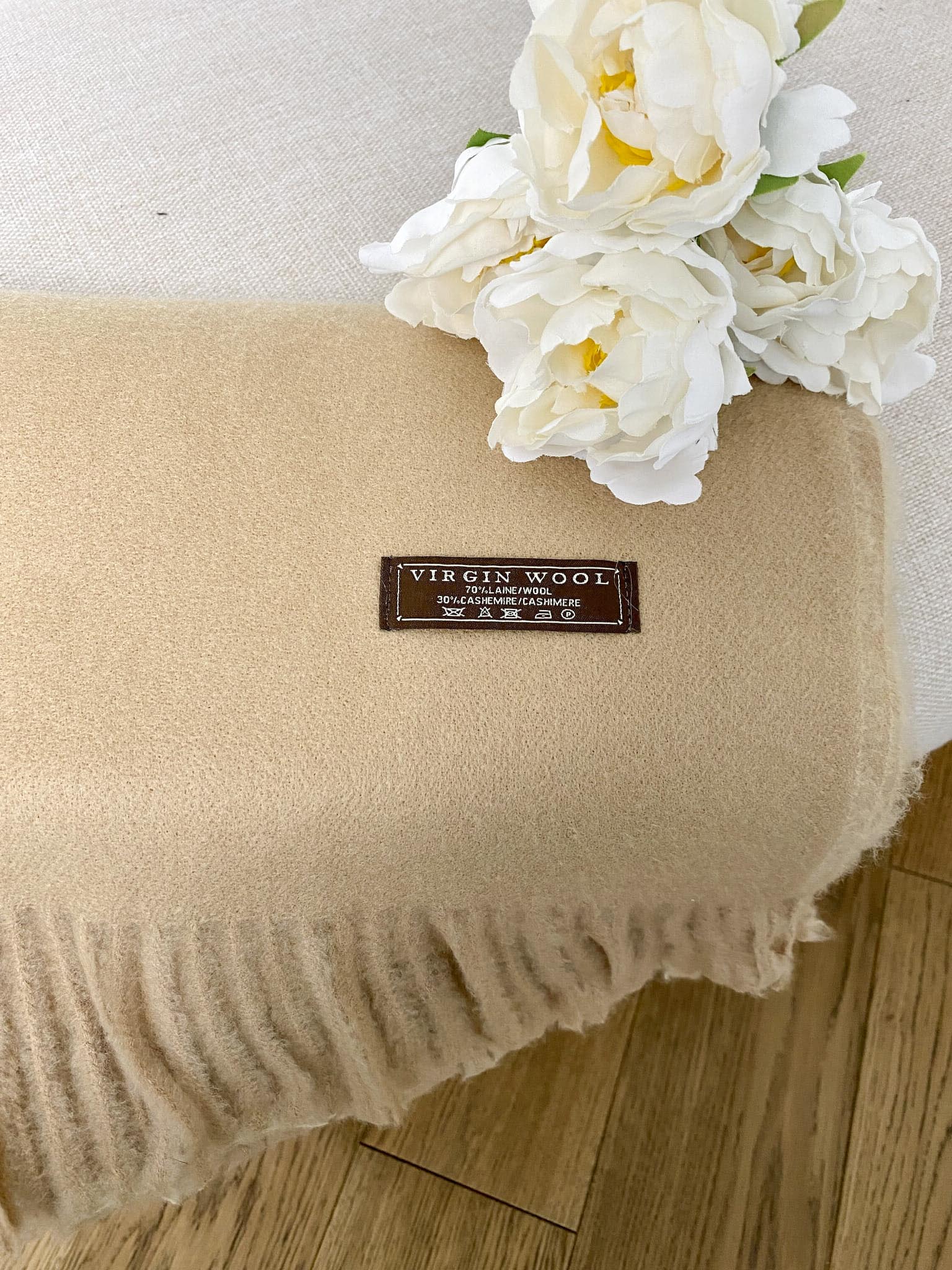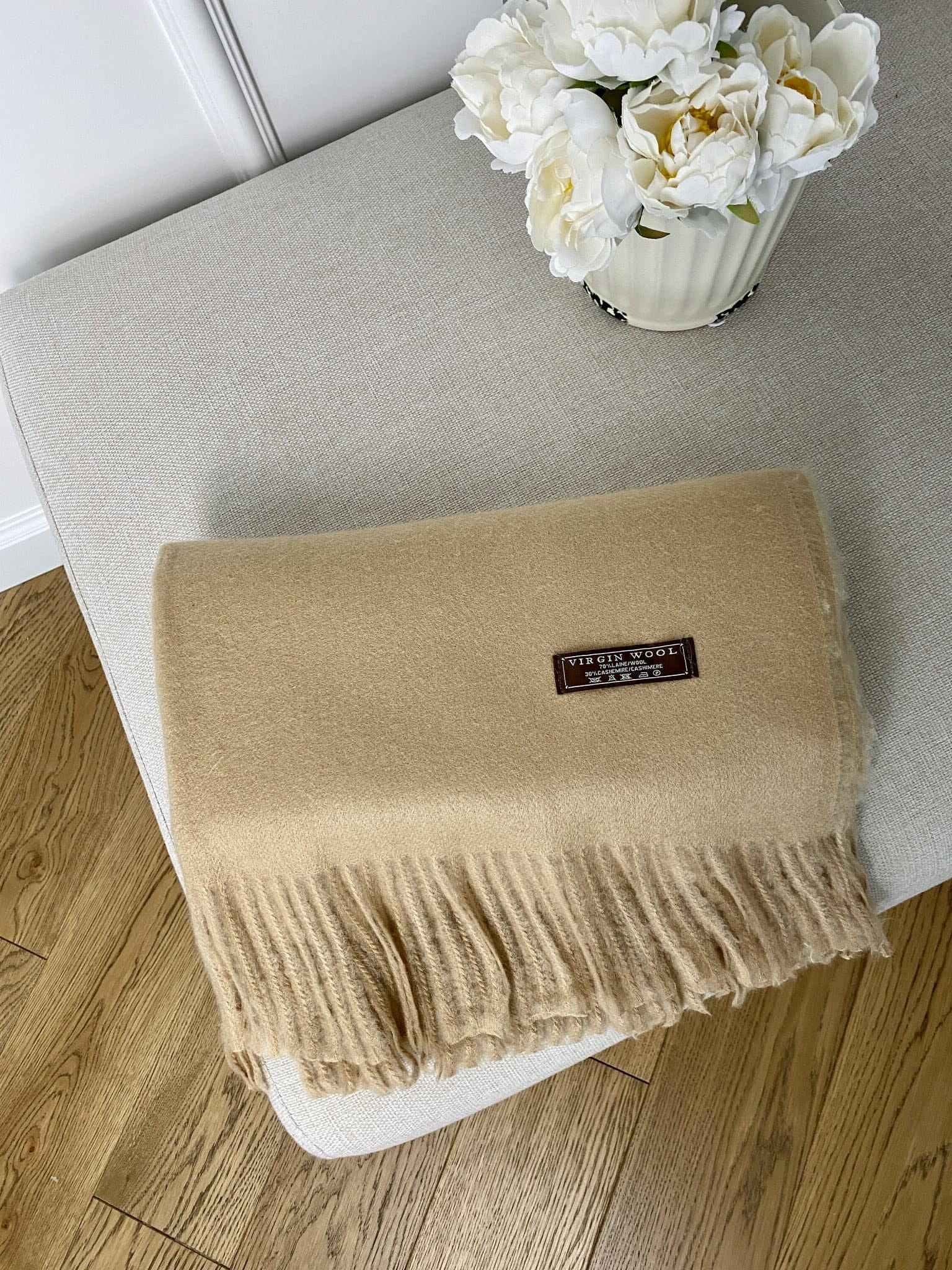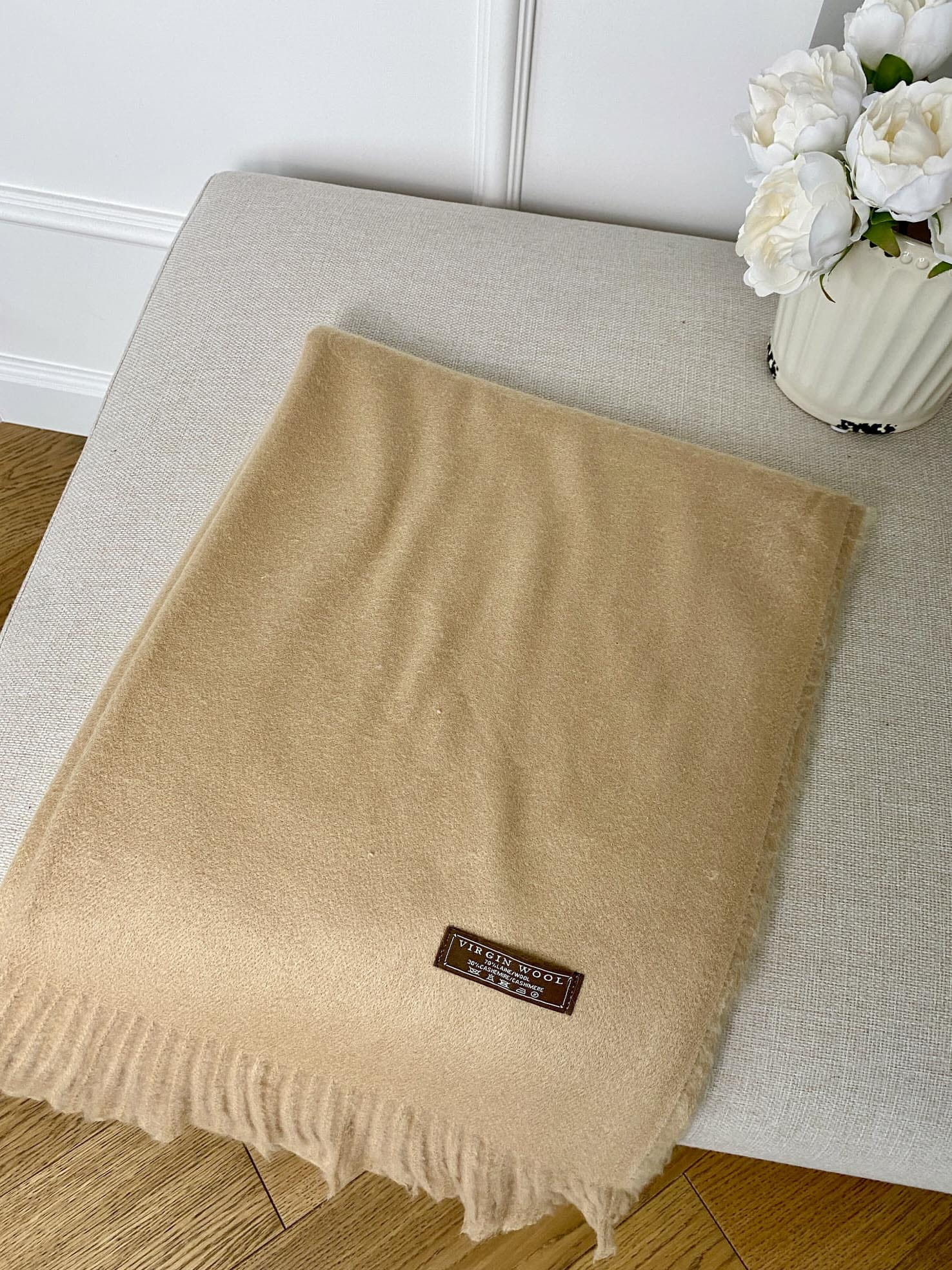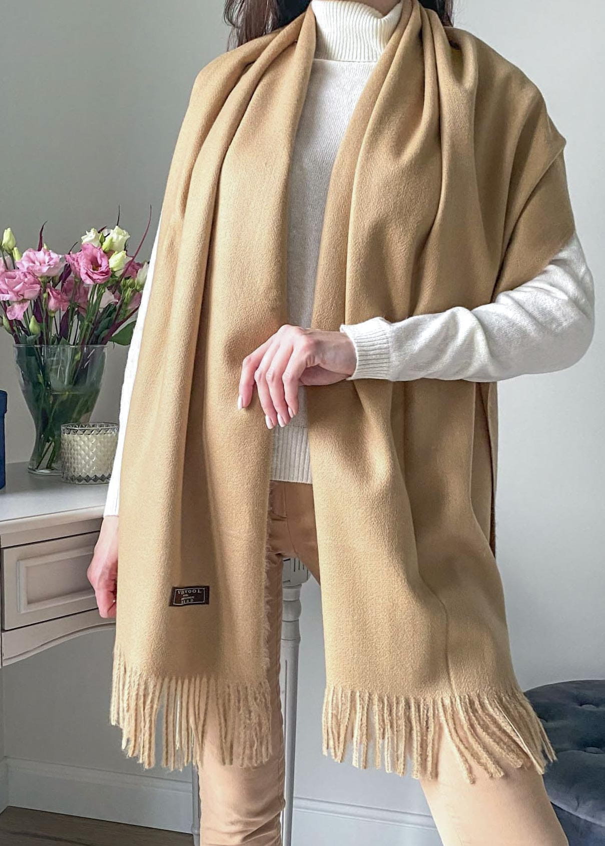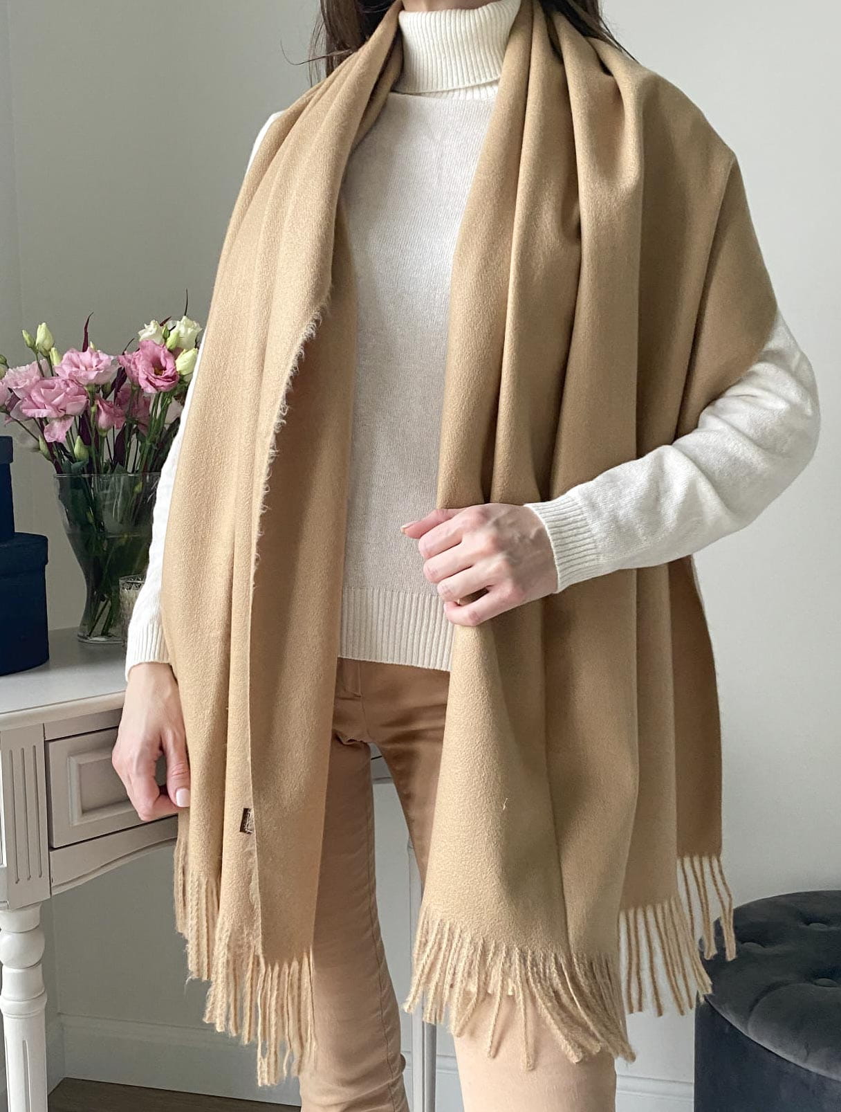 Szal jest bardzo ciepły dzięki zawartości wełny i kaszmiru w składzie.